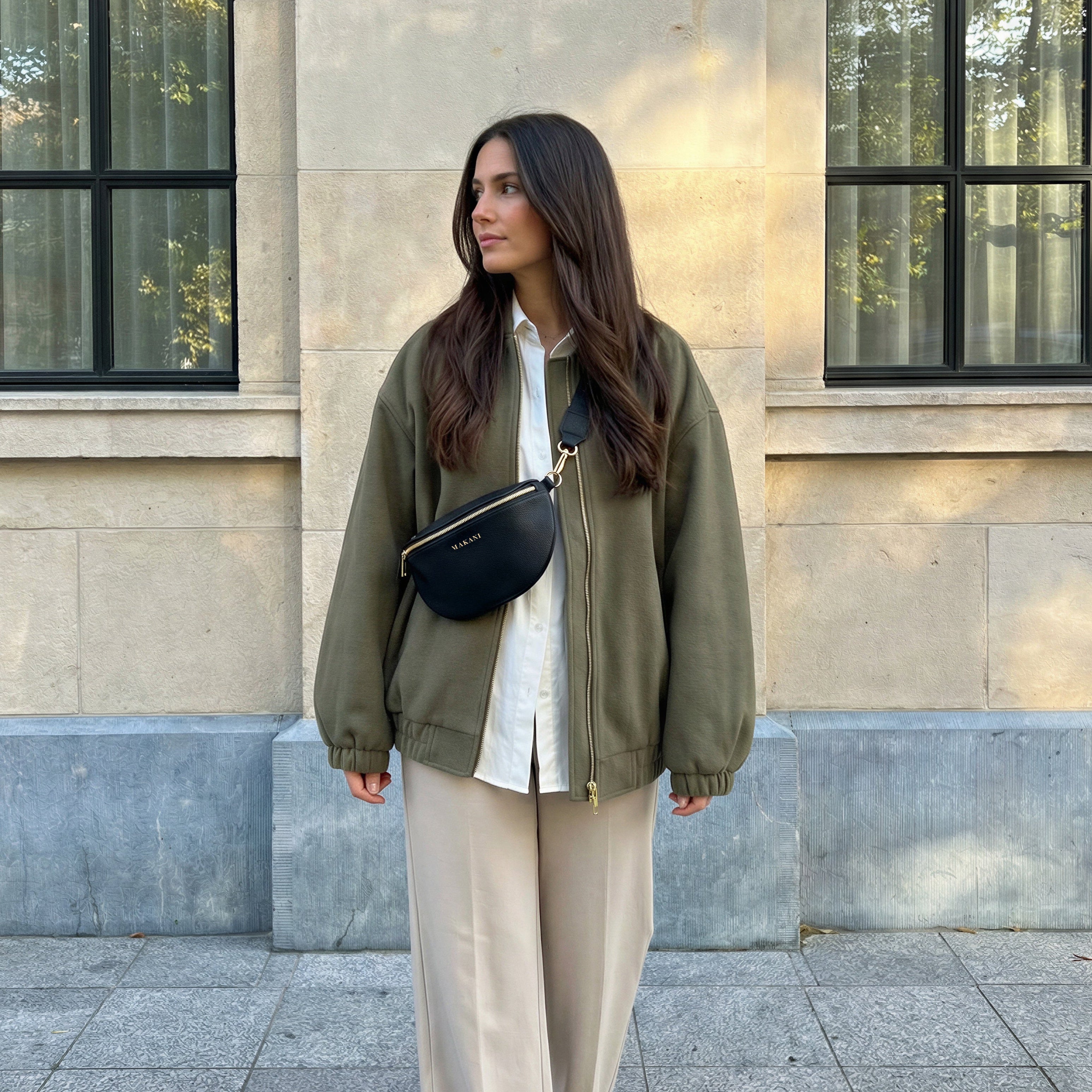 Die Chest Bag ist nicht nur ein aktueller Modetrend, sondern überzeugt zudem mit einem hohen praktischen Nutzen. In dem großen Hauptfach finden das Portemonnaie oder der Schlüssel einen sicheren Platz. Für kleinere Accessoires findet sich hier zudem ein weiteres, separates und kleines Fach. Natürlich kann die gesamte Bag mit einem Reißverschluss gesichert werden, um so alle Gegenstände sicher verstauen zu können. Eine Besonderheit stellt ein wechselbares Strapsystem dar. Mit diesem kann der Strap einfach getauscht werden, eine individuelle Anpassung ist somit einfach möglich. Bei der Produktion setzen wir auf hochwertige und widerstandsfähige Materialien. Das genutzte Leder ist vegan und überzeugt mit einer angenehmen Haptik. Das Leder, der prägnante MAKANI-Schriftzug an der Vorderseite und die messingfarbenen Elemente am Reißverschluss und der Strap sorgen für ein modernes Erscheinungsbild, so kann die Chest Bag hervorragend zu unterschiedlichen Outfits kombiniert werden.