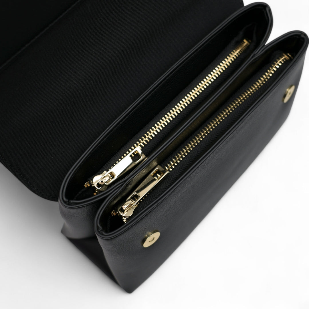 Mit ihren kompakten Maßen von 23 x 8 x 14 cm bietet NANI trotz schlanker Silhouette viel Stauraum. Zwei separate Hauptfächer mit Reißverschluss sorgen für Übersichtlichkeit und Sicherheit, ergänzt durch je ein Innenfach – eines mit Zipper, eines offen – für kleine Essentials. Der praktische Magnetverschluss ermöglicht gleichzeitig schnellen Zugriff. Die Tasche wird mit einem 1,8 cm breiten, längenverstellbaren Taschengurt (109 –122 cm) geliefert, der bequemes Tragen sowohl als Schulter- als auch als Crossbody-Bag erlaubt.